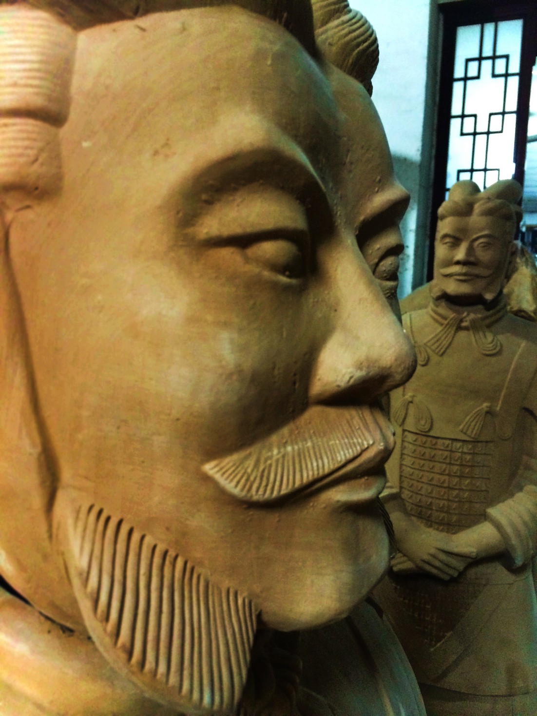 terracotta-soldier-in-kiln-xian-2Our driver dropped us off on a narrow street and headed down the road.  Our awesome guide, Elsie, took us through a brick archway surrounded by bamboo and into a courtyard.  We had no clue why.  It turned out to be one of the workshops where terracotta warrior souvenirs are made and we actually were going to meet some of the potters and work WITH them.