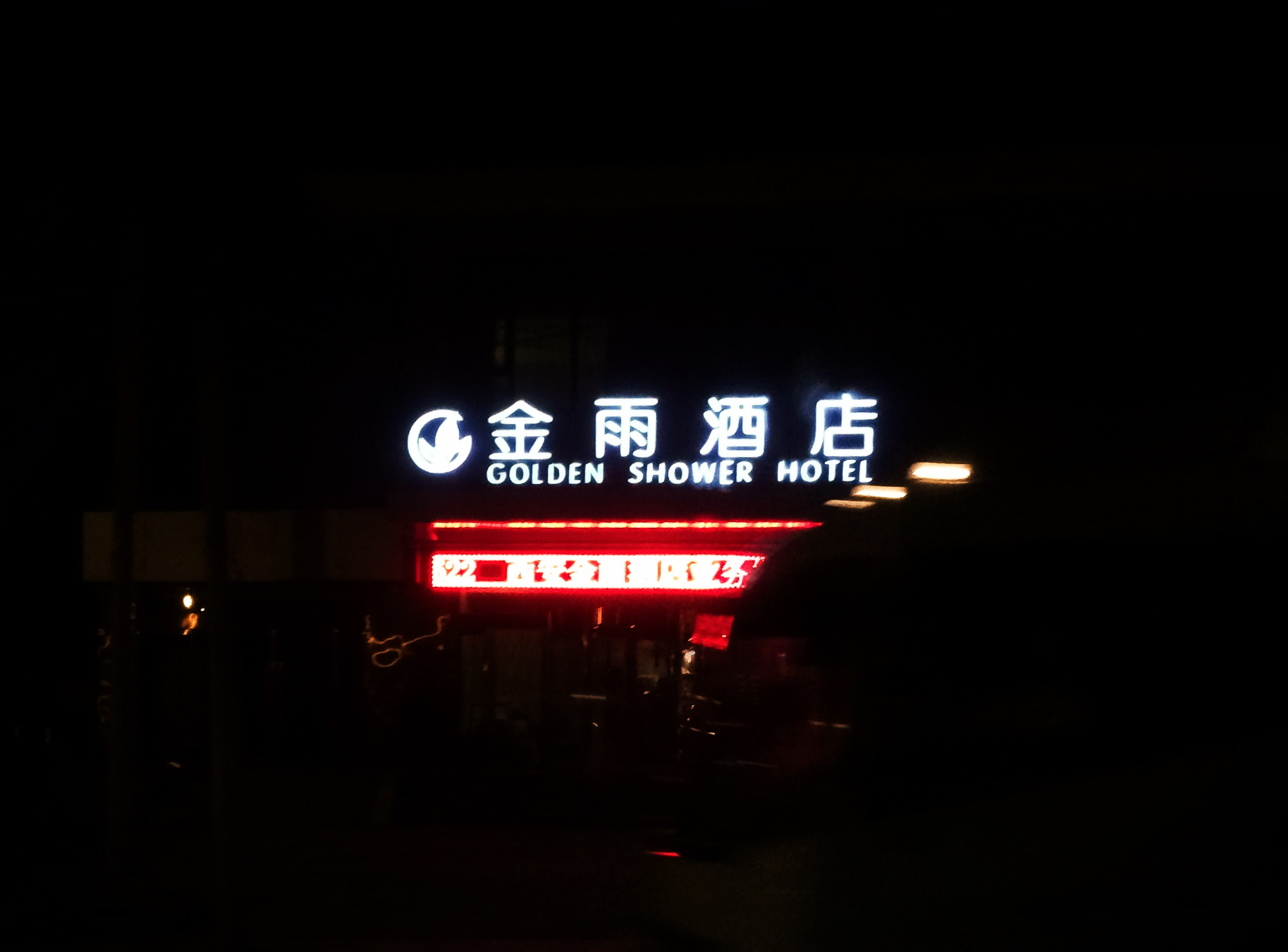 We spotted cool architecture, got a preview of the ancient city wall, and started experiencing the unfortunate grammatical errors that plague Chinese signage.  The first one we saw was the Golden Shower Hotel.  Luckily for us we got to pass it again later in our trip and snapped a picture.