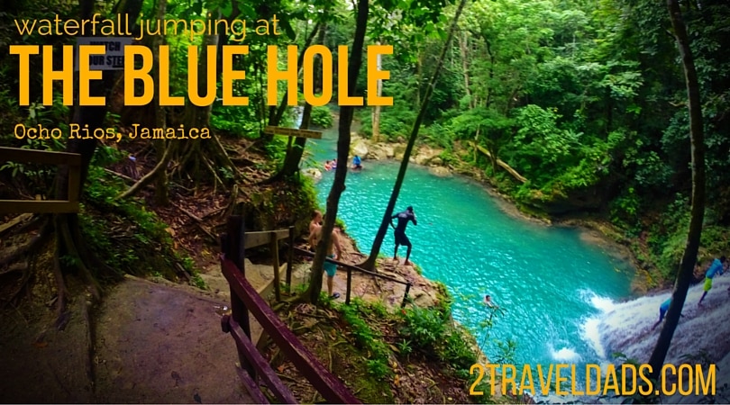Jumping off waterfalls at the Blue Hole in Ocho Rios, Jamaica is an awesome jungle experience. Perfect water, some thrills and beautiful flowers. 2traveldads.com