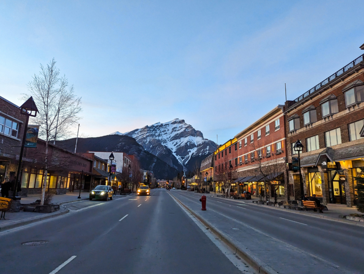 Exterior of Mount Royal Hotel with Canadian Rockies at Sunset downtown Banff Alberta 2