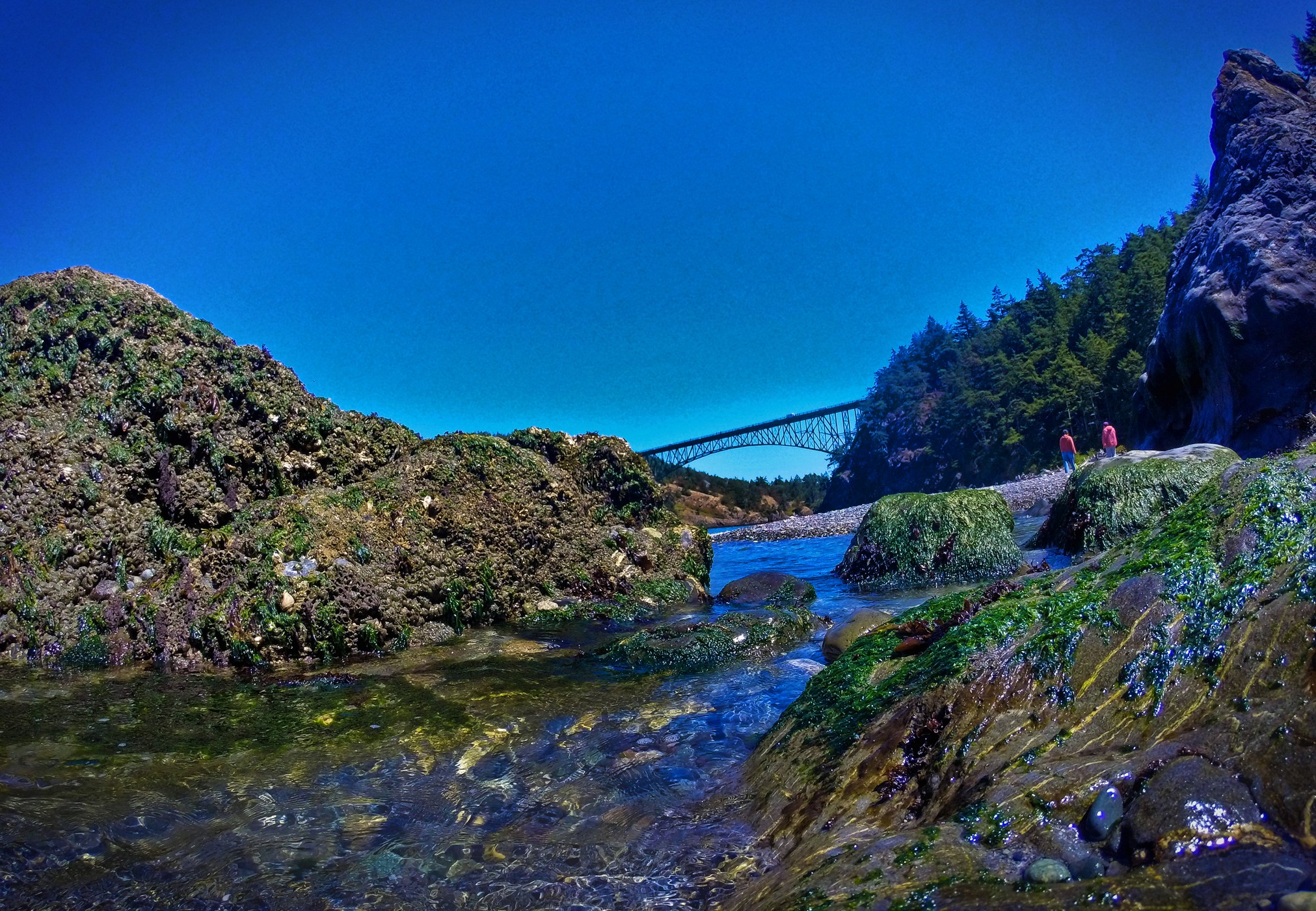 View of Deception Pass Bridge Deception Pass State Park Whidbey Island with tidepool
