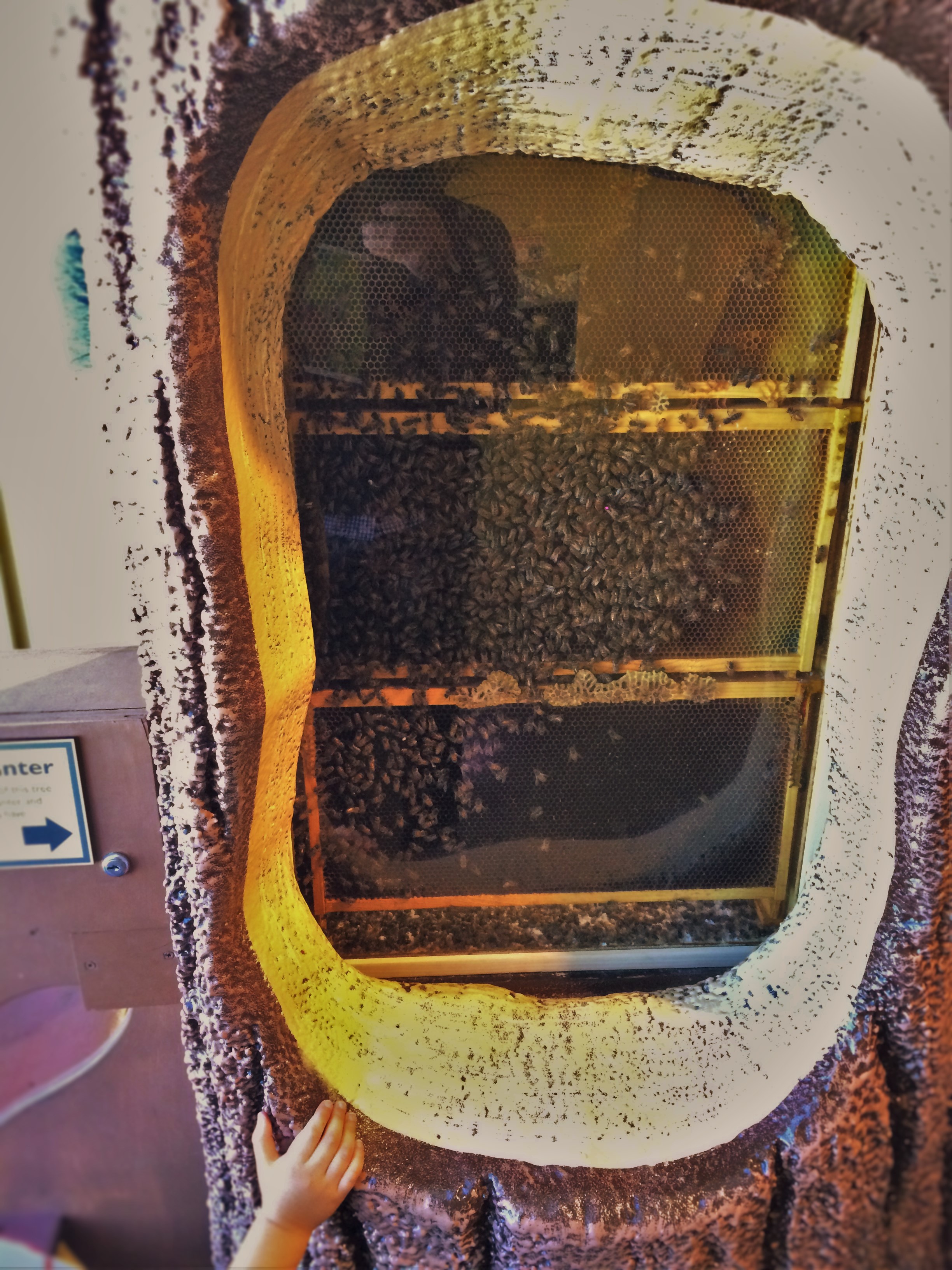 LittleMan watching bees enter their bee hive at the Butterfly Pavilion Denver Colorado 1Also, there is so much more there than butterflies.  The Butterfly Pavilion has an amazing collection of bugs ranging from cockroaches to tropical spiders, praying mantises to ants.  Really, the diversity of the bugs was phenomenal.  Oh, and one of the most fascinating displays that was the most captivating for the kids was the bee hive.  The Butterfly Pavilion has a cut-away bee hive with a clear tube leading to the outside.  You can watch the bees flying in, going through the tube, scurrying about the hive.  And there’s a bee counter that tells you how many bees are going in and out of the hive.