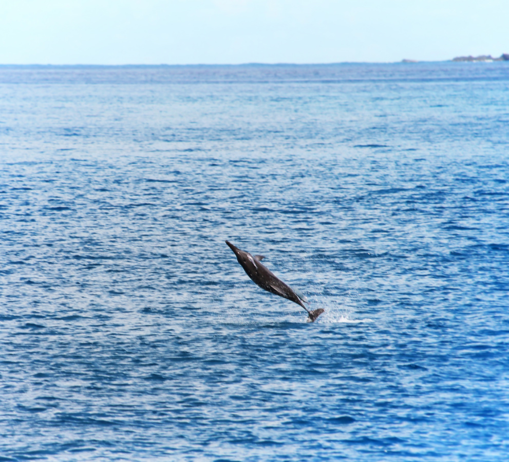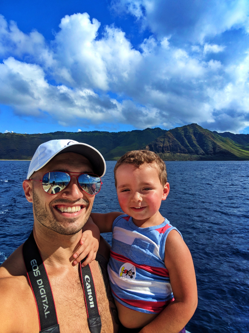 Whenever we’re in a tropical location we try to get out on the water, and particularly INTO the water. We headed out of Aulani bright and early and boarded our catamaran with a goal of seeing some Hawaiian spinner dolphins and doing some snorkeling. We got way more than we bargained for. On the drive to the marina, just looking out the window we say manta rays jumping out of the water just off shore. We got to the marina and there were yellow tangs and other fish swimming below our feet.