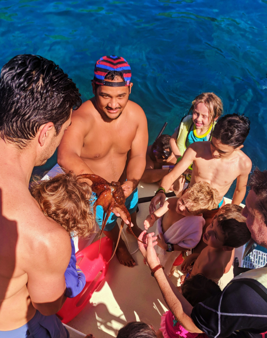 One on board we had a great time connecting with other traveling families and all the kids making new friends… and then the dolphins showed up and everybody was focused on the nature!! While we were watching the Hawaiian spinner dolphins, several Hawaiian green sea turtles showed up around us. It was an awesome experience with the kids.