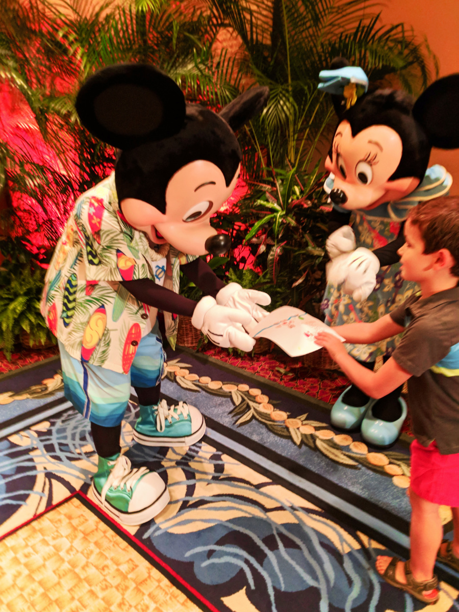 Cute story: when Oliver saw Mickey and Minnie walk in he made a picture for Mickey immediately. He just loves him so much that he had to take Mickey his art… to which both Mickey and Minnie were so impressed. Seriously, Oliver LOVES Mickey.