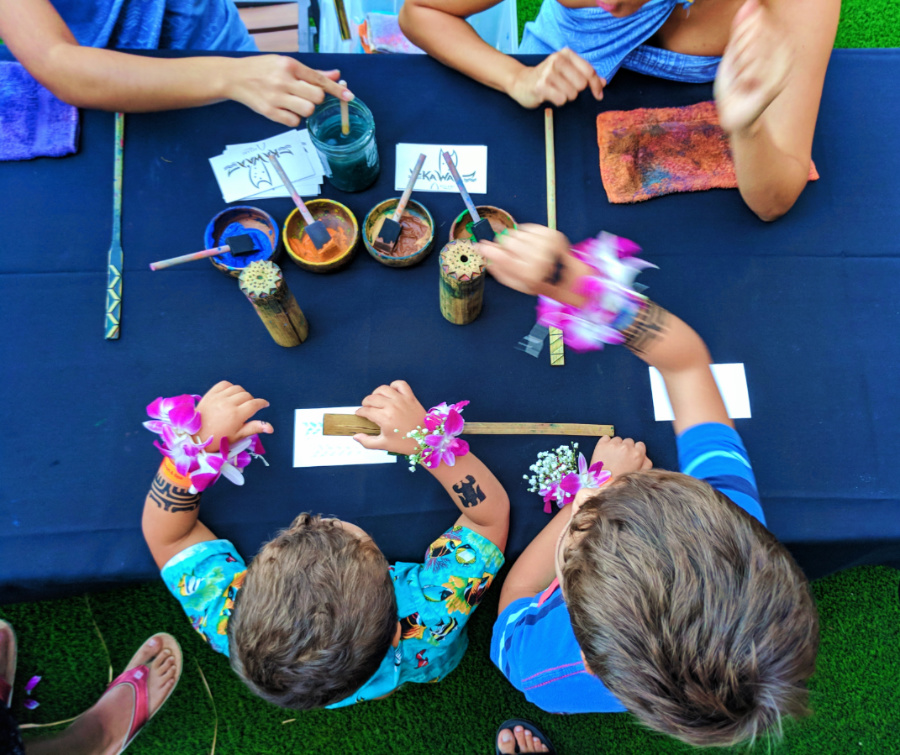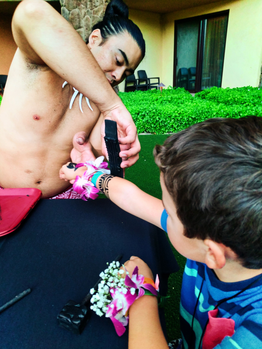 Wow. This was such a cool, unique experience and I’m so glad we got to do it. With delicious food (yummm, poke) and a really impressive show, the Ka Wa’a Luau on property at Disney’s Aulani is phenomenal. The pre-show is all about the kids: from lei making and poi pounding to getting temporary Hawaiian tattoos and bamboo stamping.