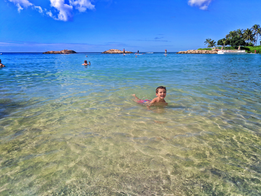 We love a good beach with waves that are fun but not too big. The cove at Disney’s Aulani is ideal for all ages when it come to water and waves. With breakers at the cove entrance and a reef just offshore, the tide pulling in and out of the cove is super mellow and offers just the right level of fun for smaller kids. In comparison to other beaches around Oahu, this one is really the most chill.