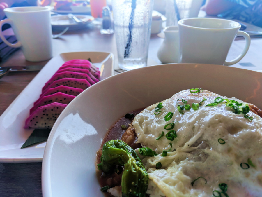 We had lots of fresh fruit and some amazing macadamia nut pancakes, but the thing that really stood out was the Loco Moco. For those who aren’t quite down with the food of the Islands, Loco Moco is an awesome and delicious combo of a hamburger patty (or S.P.A.M.), rice, onion gravy and an egg. Sounds bizarre, tastes like heaven.