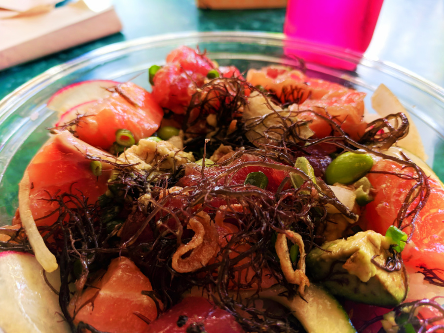 We’ll start here because this was our favorite. A quick-service restaurant near the pools, Ulu Cafe has a lot of grab-and-go options for lunch and snacks. This is also where you can get a pretty delicious kalua pork flatbread or you can build your own poke bowl. The poke here is just as good as what you get from the food trucks around the island, which are some of the best places to eat on Oahu.