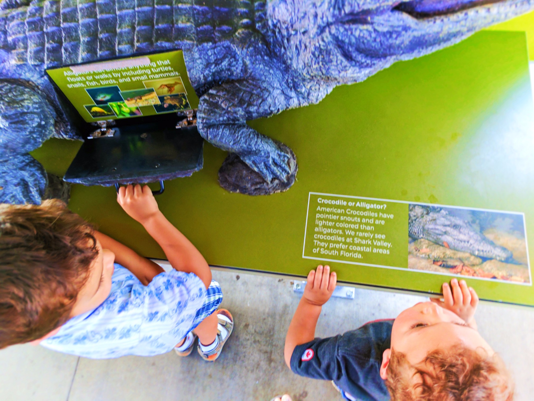 While we normally love all of the Park Rangers that we meet, the two manning the station at the Gulf Coast Visitors Center of Everglades National Park were the most awesome.  They were all about talking to the kids and helping them learn about and experience the environment and wildlife of the Everglades.  With lots of animal specimens and microscopes, for being a small Visitors Center, the Rangers made it a really fun, hands-on experience.  Thumbs up!