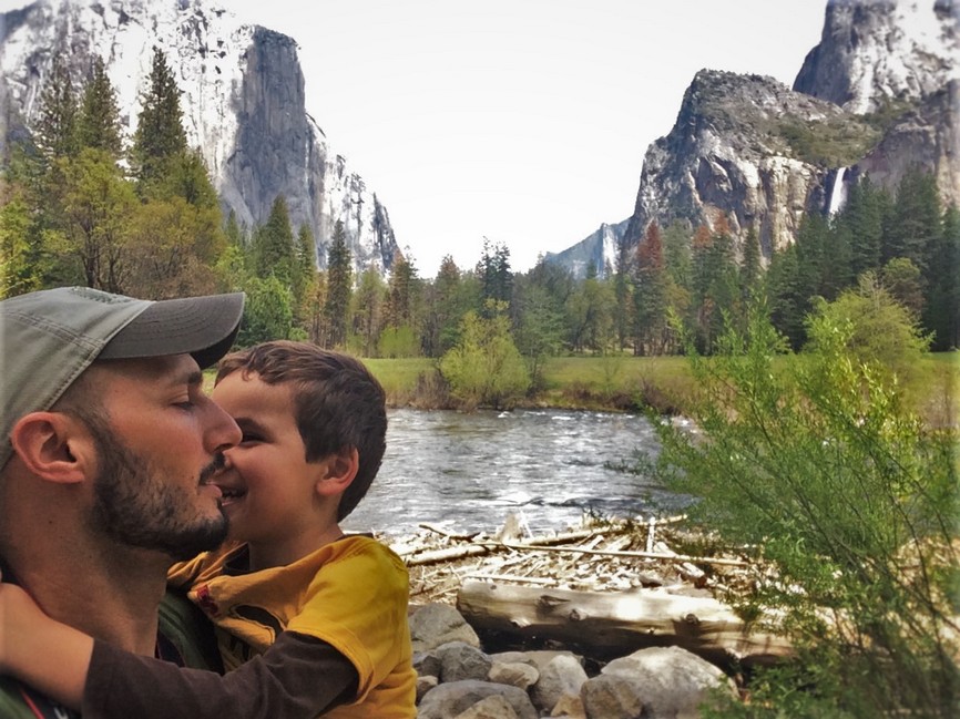 Rob Taylor and LittleMan at Merced River on tram tour of Yosemite Valley Floor in Yosemite National Park 1