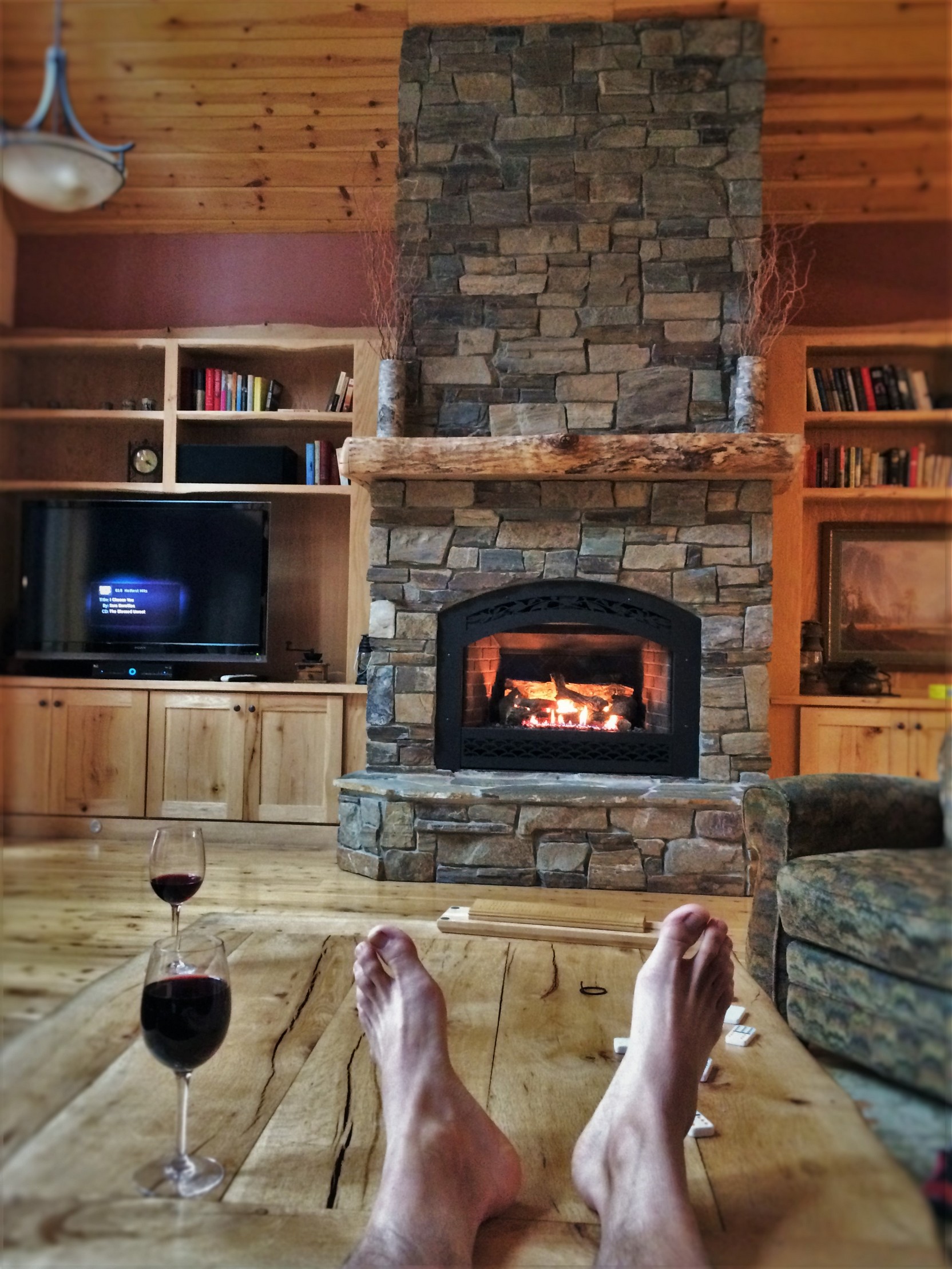 Rob Taylor feet and wine with stone fireplace in John Muir House at Evergreen Lodge at Yosemite National Park 1
