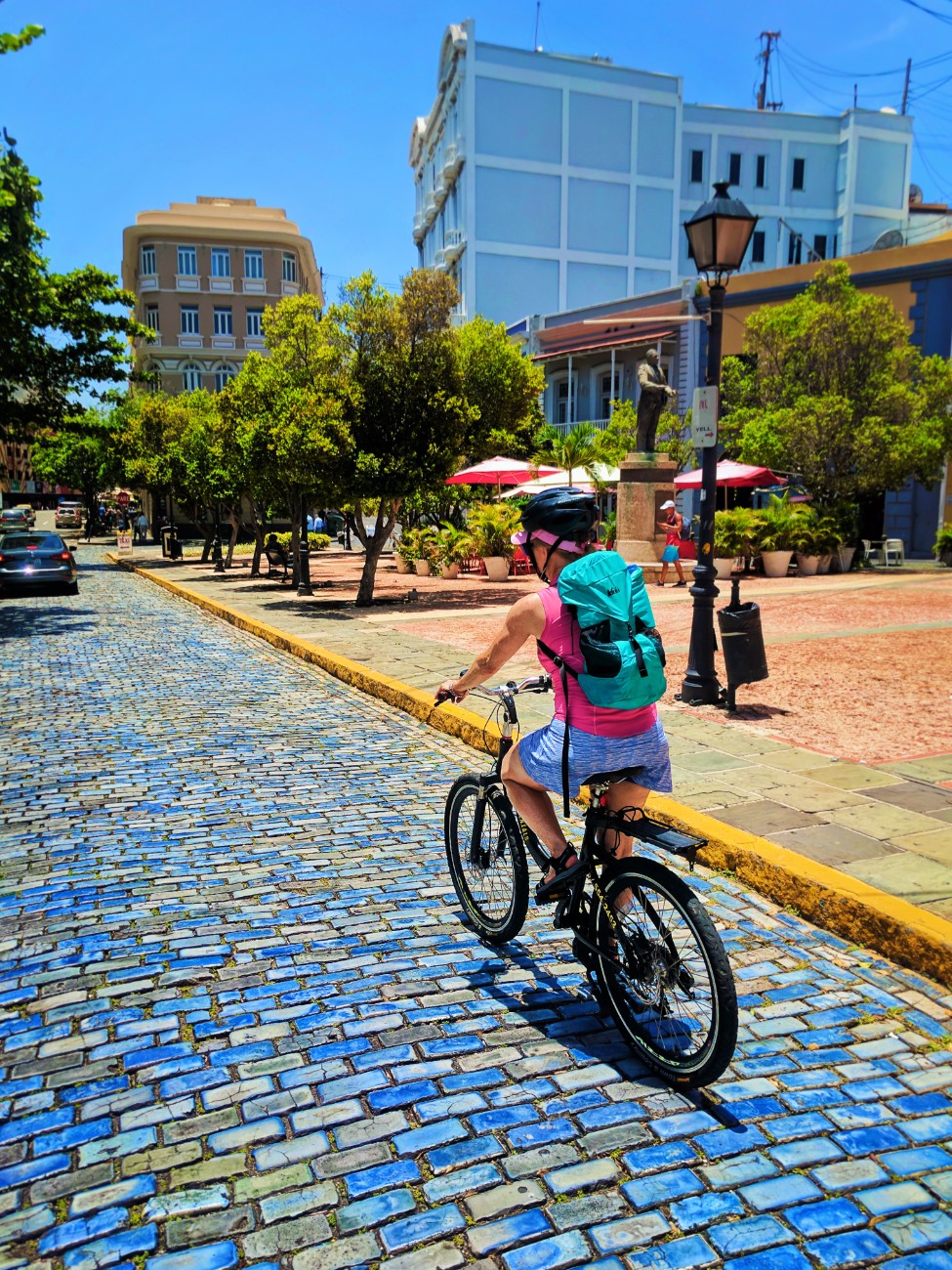 Maureen biking through Plaza Malecon in Old San Juan Puerto Rico 1