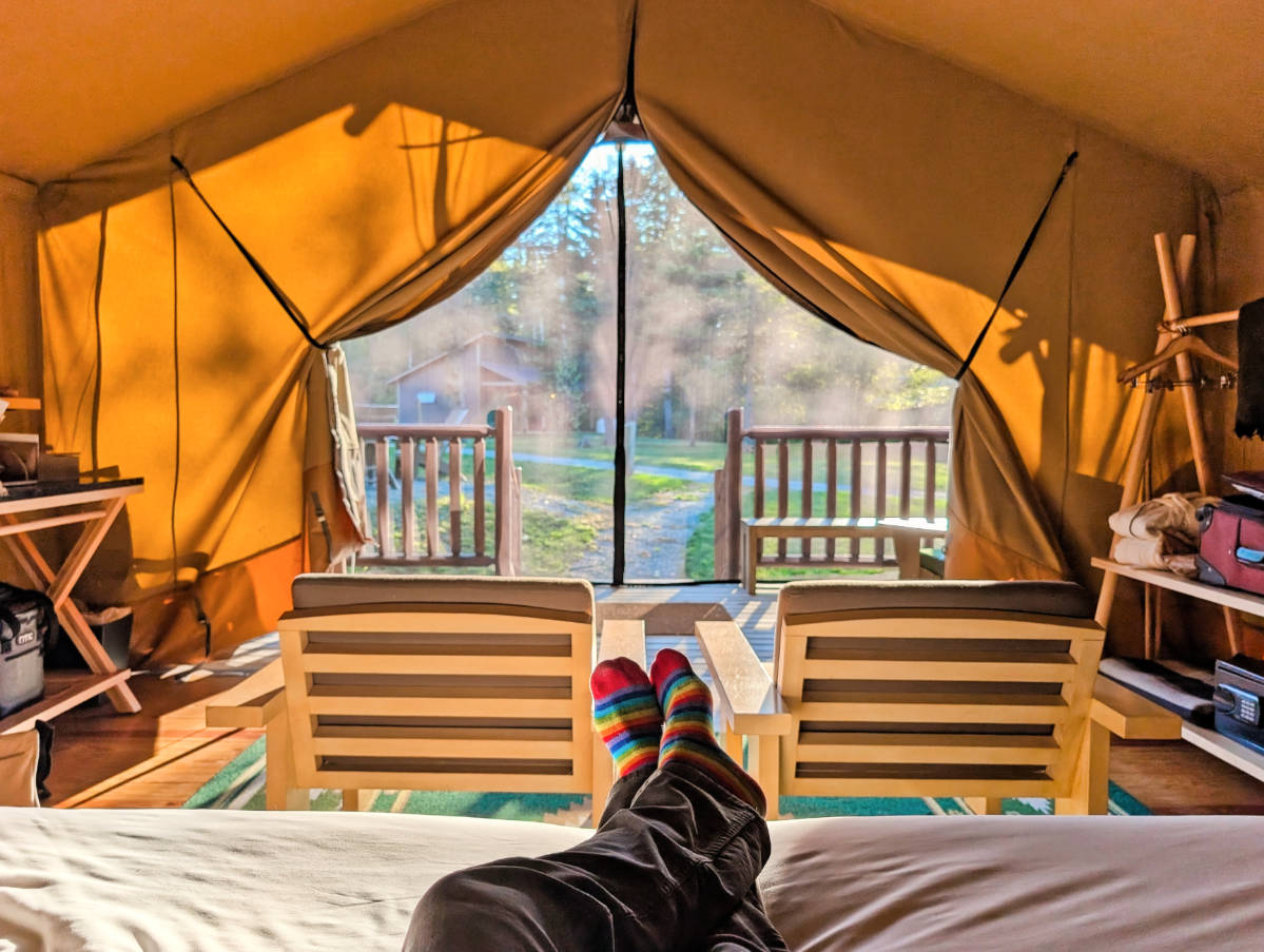 Relaxing in Platform Glamping Tent at Terramor Outdoor Resort Acadia National Park Bar Harbor Maine 1