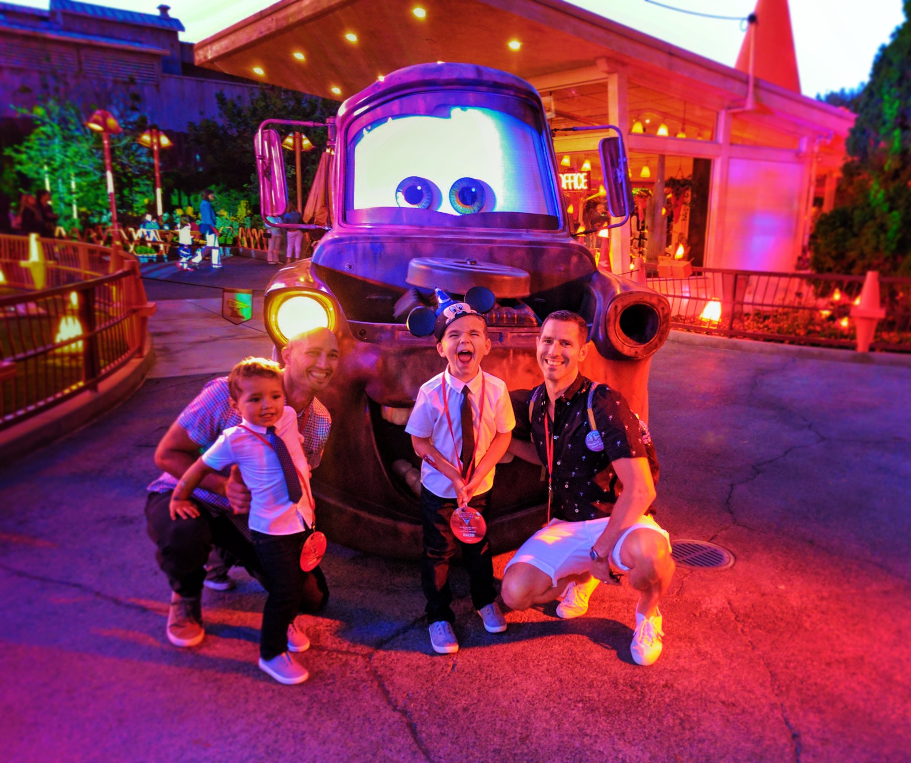 Taylor Family with Mater Cozy Cone Cars Land at night Disneys California Adventure 1
