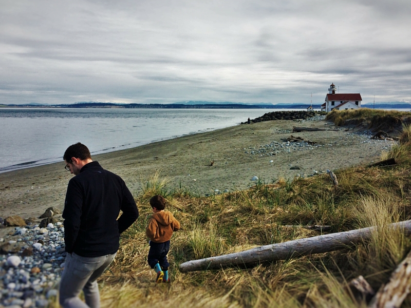 Chris Taylor and LittleMan on beach at Fort Worden Port Townsend
