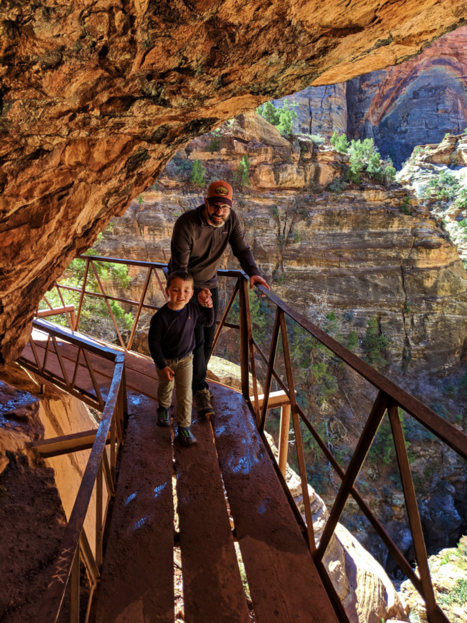 Easiest kid friendly hike in Zion National Park, hands down. At a mere quarter of a mile from shuttle stop to trail end, it’s an fun and easy adventure with kids. The trail crosses a bridge to start and then continues up the hill to the cliff wall. There are lots of vegetation markers along the way, so for any worldschooling kids or interested adults there are lots of learning opportunities as you hike.