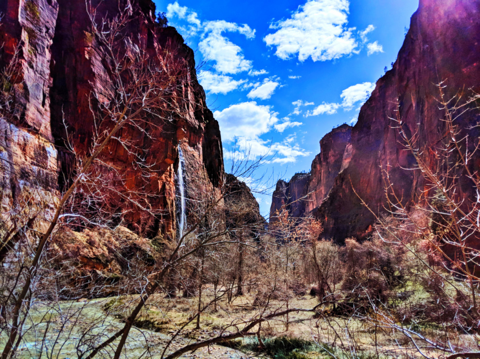 Continue on to hang out behind yet another waterfall and enjoy the view back down through Zion Canyon towards the main entrance. This is a great place for family photos and even a small picnic if you’ve brought it along.