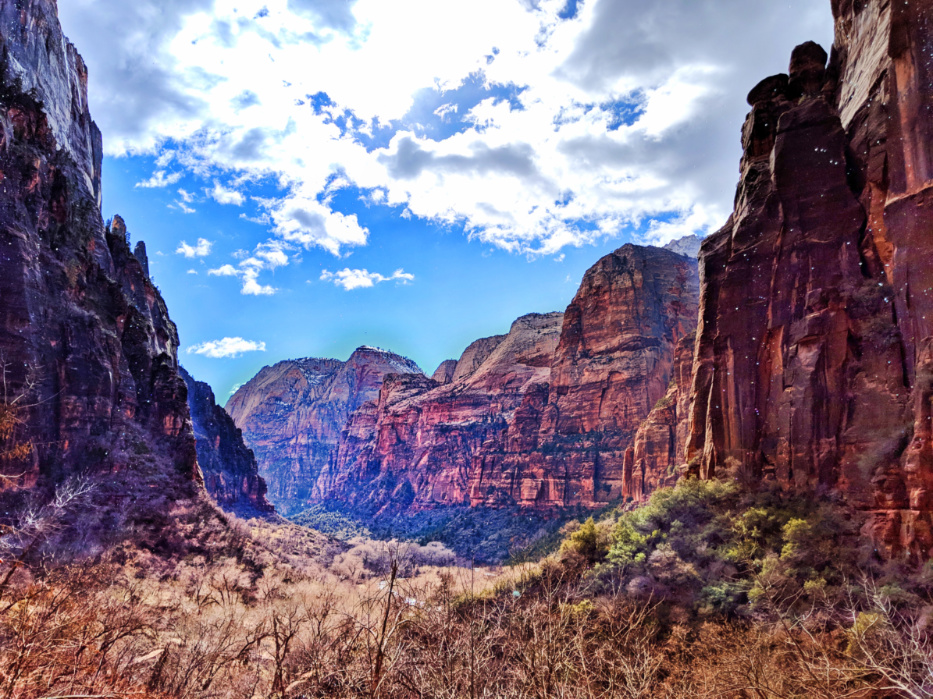 Once at the trail head, you start up the switchback trail to a point where it evens out. The views get more and more interesting as you go, moving on cliffsides, crossing boardwalk overhangs, and hiking through a shallow cave. When you reach the end, the view is stunning with an unobstructed vista of the east side of the V-shaped Zion Canyon.