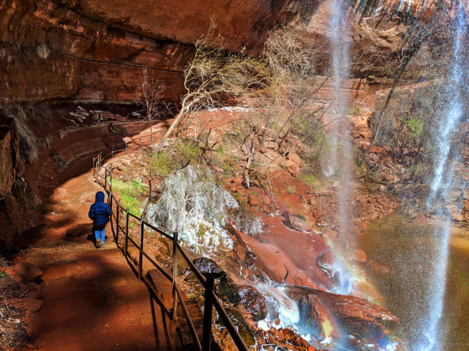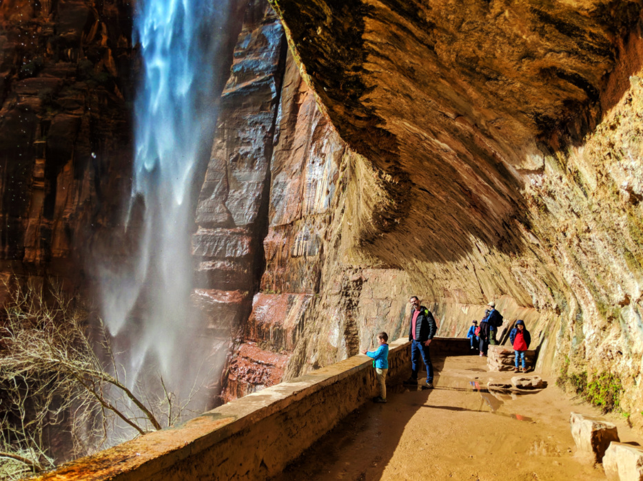 Continue on to hang out behind yet another waterfall and enjoy the view back down through Zion Canyon towards the main entrance. This is a great place for family photos and even a small picnic if you’ve brought it along.