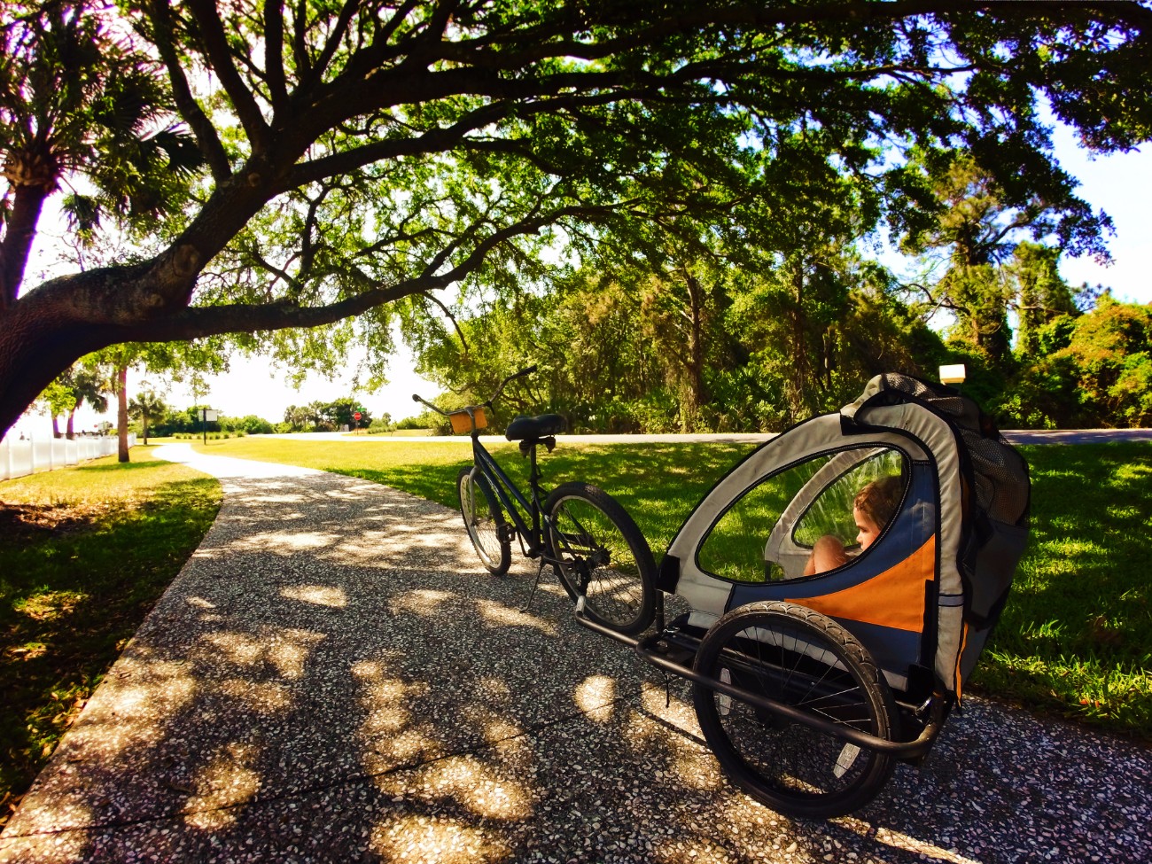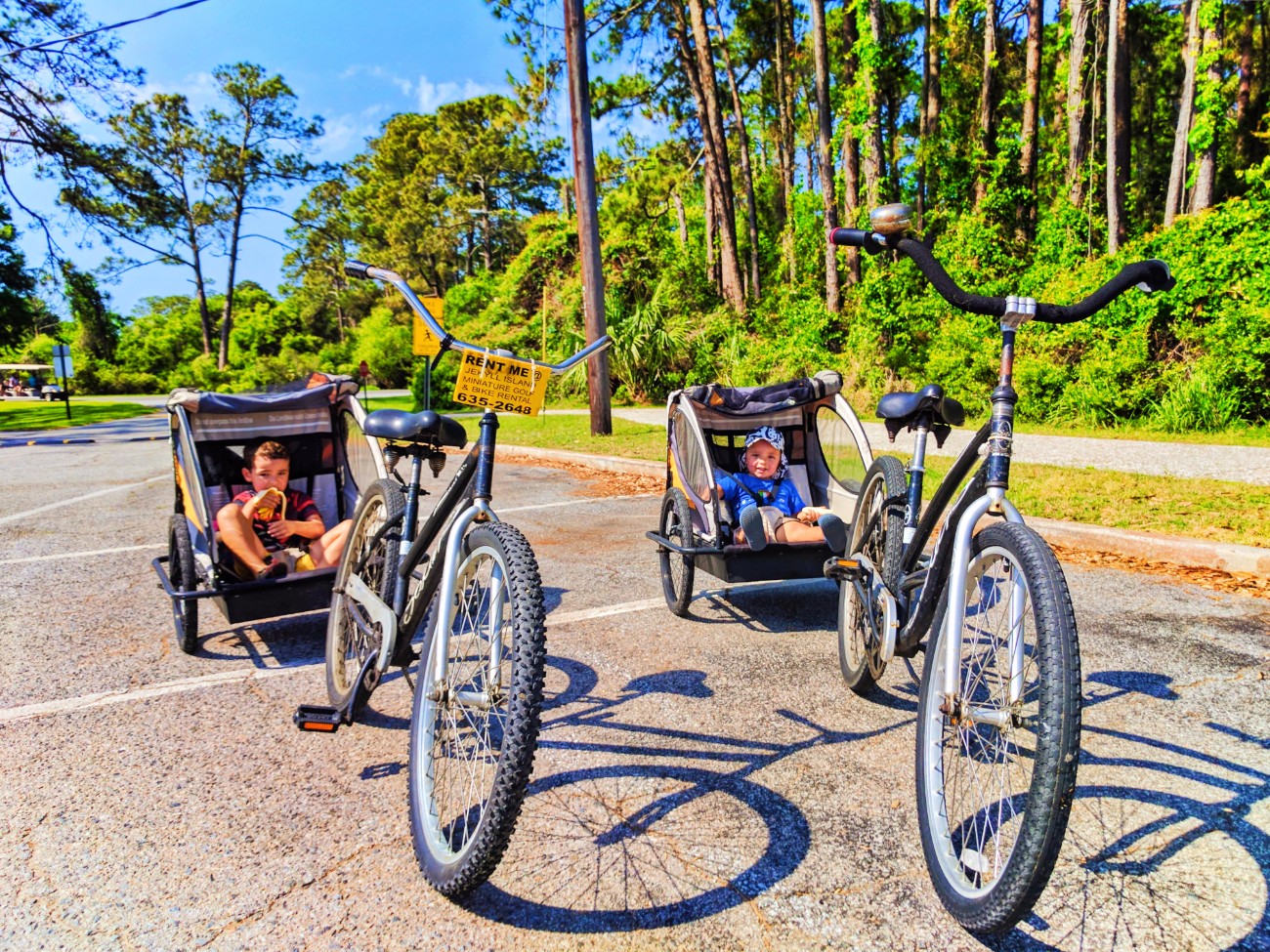 We love when we get physical activity on vacation. Biking really does seem to be our go-to lately, and also kayaking. So when we were on Jekyll Island the opportunity to ride bikes along the beach and through the neighborhoods had to be taken. We rode bikes on St Simons Island also and got to go all the way out to Fort Frederica which was awesome. Here our bikes took us from the mini golf complex in the middle of the island all the way up to Driftwood Beach and back. FYI, even on flat ground beach cruiser bikes with child trailers will wear you out.