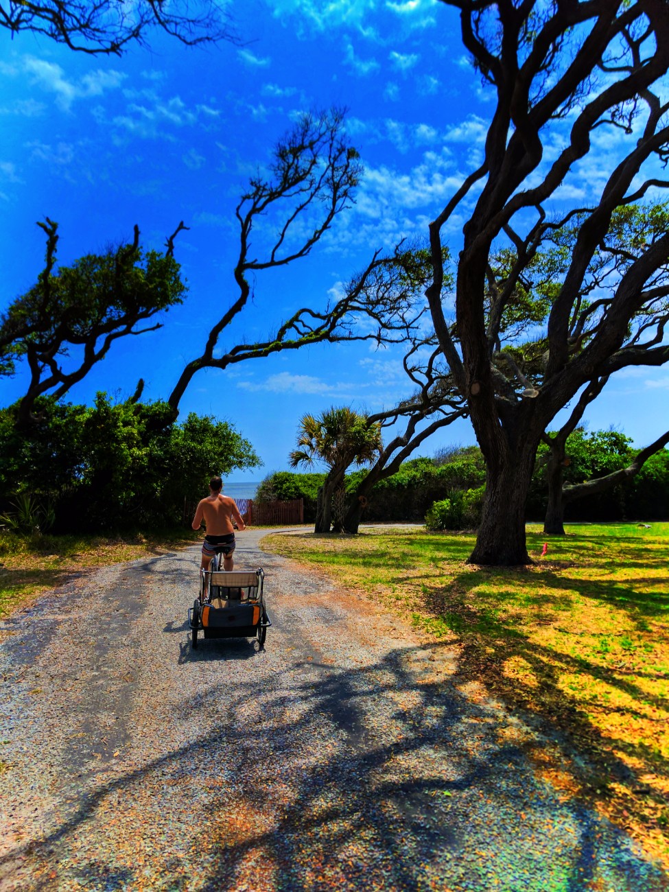 We love when we get physical activity on vacation. Biking really does seem to be our go-to lately, and also kayaking. So when we were on Jekyll Island the opportunity to ride bikes along the beach and through the neighborhoods had to be taken. We rode bikes on St Simons Island also and got to go all the way out to Fort Frederica which was awesome. Here our bikes took us from the mini golf complex in the middle of the island all the way up to Driftwood Beach and back. FYI, even on flat ground beach cruiser bikes with child trailers will wear you out.