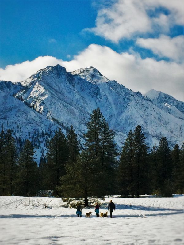 People Walking Huskies in Snow at Sleeping Lady Resort Leavenworth WA 2traveldads.com