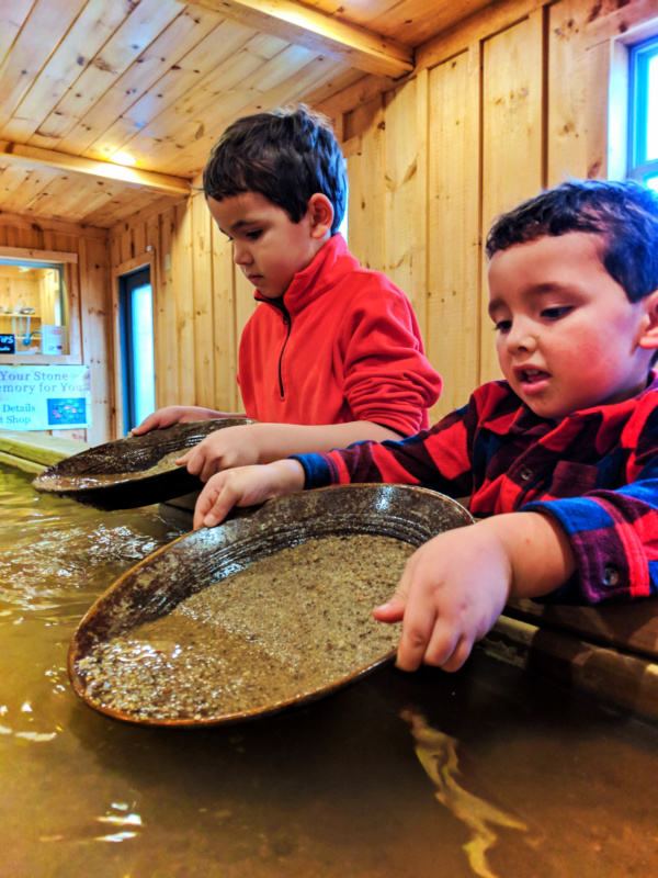 The highlight in Dahlonega for us was actually visiting a mine. We went to the Crisson Mine to do some gold panning and look for gems, and we totally struck it big. The mine crew was great with the kids helping them swirl and find gold, and then we all had a blast doing a scavenger hunt for gems. We left with emeralds, citrine, garnets and more. Bonus for us: outside was a whole setup showing how mining works with displays, working exhibits and tons of mining equipment.