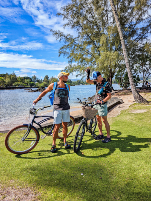 Chris and Rob Taylor Riding Bikes from SCP Hilo Hotel on Monkey Island Hilo Big Island Hawaii 3