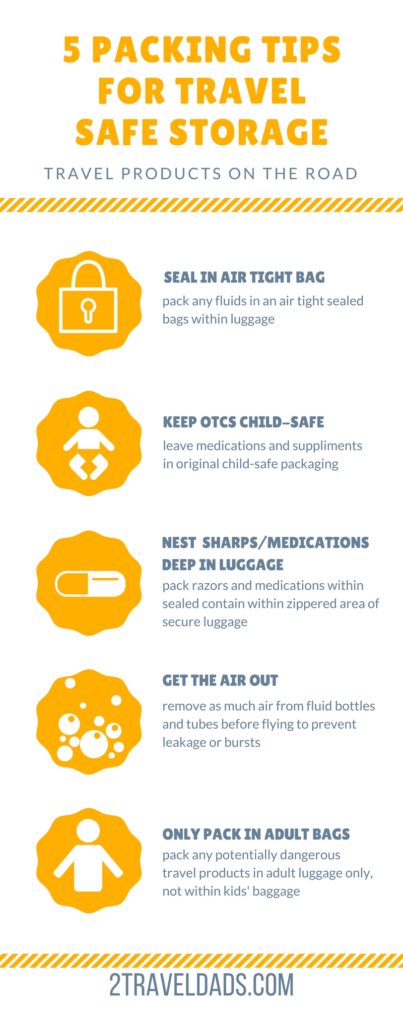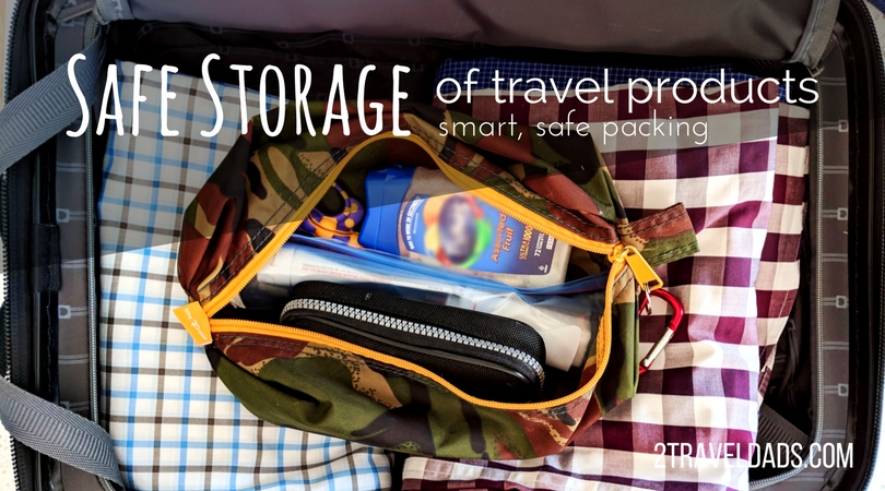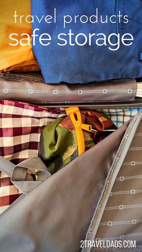 So, now that you’ve gotten our insight on how we pack and what to watch for in your own safe storage of travel products, it’s a great idea to actually take a look around, either in your home or your current hotel room, and double check to be sure that you’re storing things properly. If you peek in your bathroom is your cold medicine accessible to a little person? Is the carry-on bag you’re packing something your kids can get into and you know they’ll be safe?
