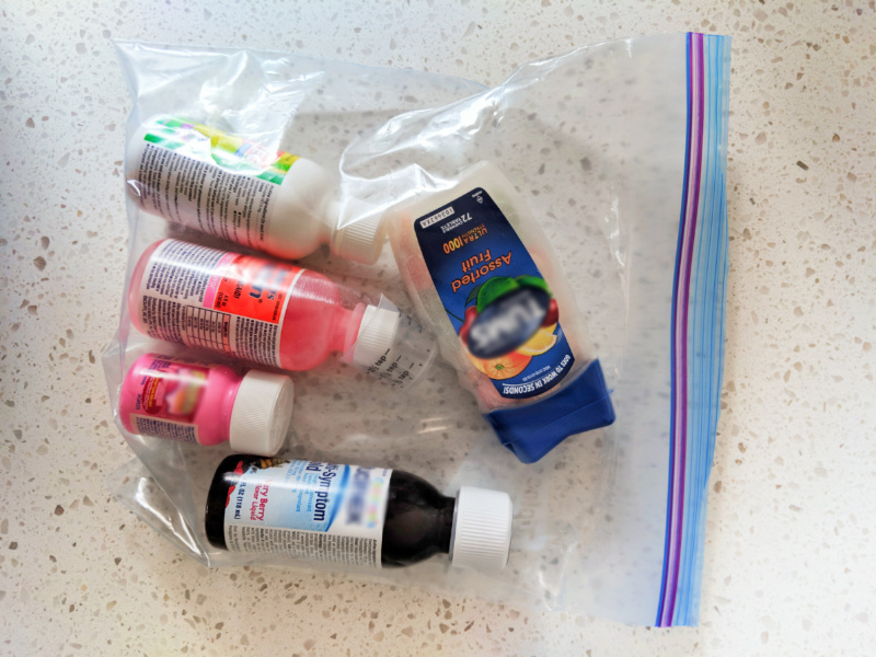 These same methods can be applied to fluid medications, such as children’s suspensions or cough medicine. When it comes to the more potent or sticky fluids, we always have them in their own bag and then be sure, at home or while traveling, to store medications OUT OF SIGHT to minimize the potential hazard.