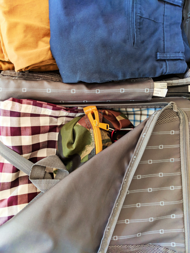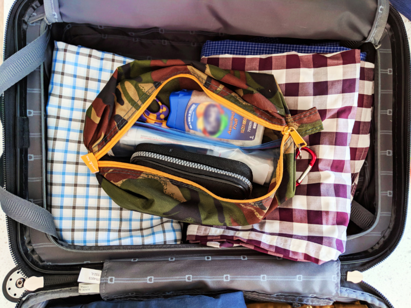 Safe storage for razors, nail clippers, tweezers, mending kits (with sewing needles) means putting them all in one clearly different smaller luggage piece. Again, this toiletry bag is packed into an adult’s luggage and not easily accessible to kids.