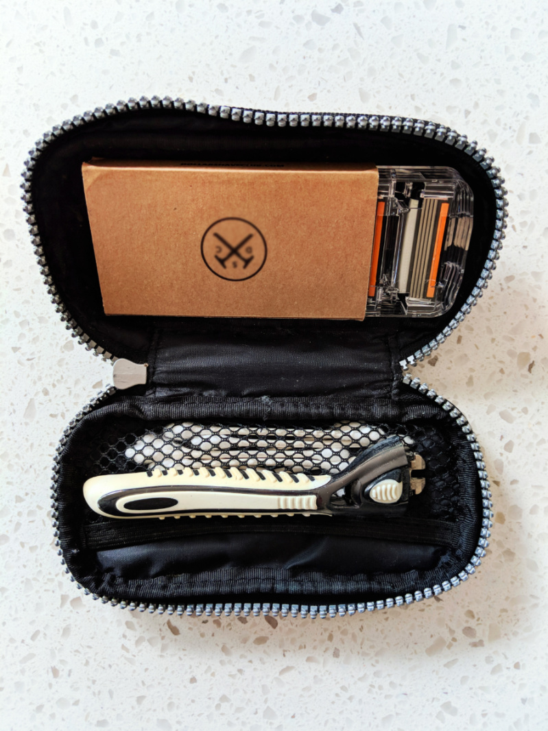 Tip: when traveling with a razor, we are sure that there isn’t a blade on the razor handle. We keep any blades in a safe storage cartridge that’s kept in our toiletry bag.
