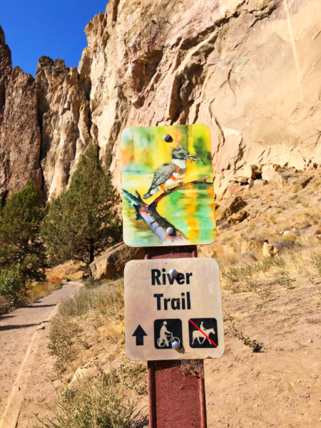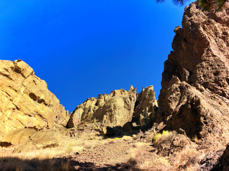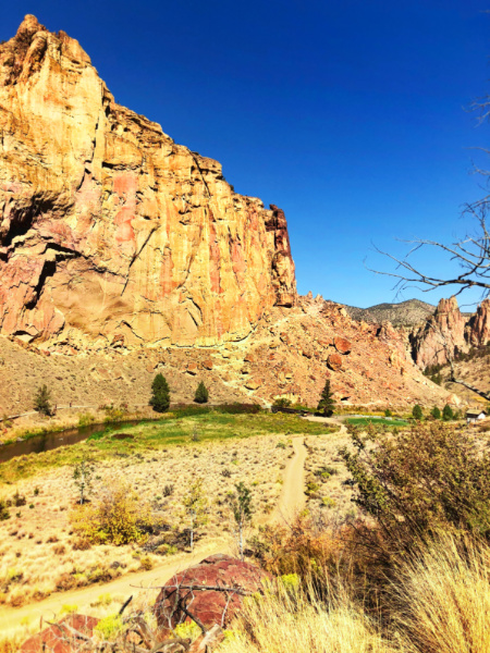 After you’ve crossed the footbridge over the Crooked River, you’ll need to go to the left. This will take you all along the river and wind you along the base of some of the most incredible sheer cliffs. There are plenty of spots to stop by the river and just take in the scenery, as well as shaded spots to take a break and watch the rock climbers. The trail is pretty easy and level for most of the way, with just a few dips and small slopes.