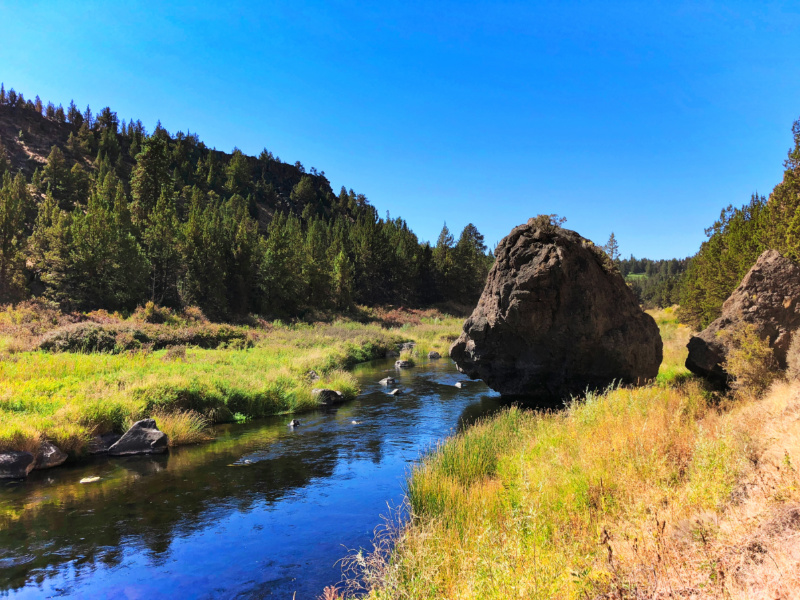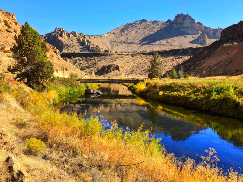 The Homestead trail heads east from the main trail head. After you’ve gone down the Chute to the canyon floor, don’t cross the footbridge. Instead, make a right and follow the river around the bend. You’ll head through the brush and rocks, hit just a few steep spots and rise from the canyon floor. As you look back, the still surface of the Crooked River will be reflecting the rocks to the west. It’s gorgeous. You can then either hike the one mile back to where you started or pop up to the eastern parking area and walk back along the road.