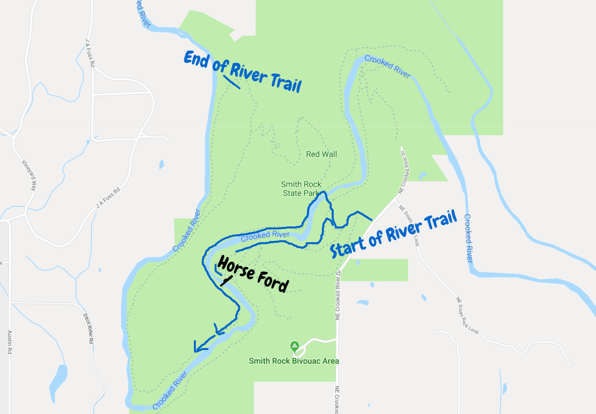 Trail option: if you don’t want to trace your steps all the way back to the trail head, you can cross the Crooked River at the Horse Ford. This is marked with signage, but it’s not for everybody. Depending on the level of the river, this could be dangerous. If you are hiking with small kids, this is only an option if you can carry them across the river with confidence. Even when the river is at a low level, it’s still strong and deep.