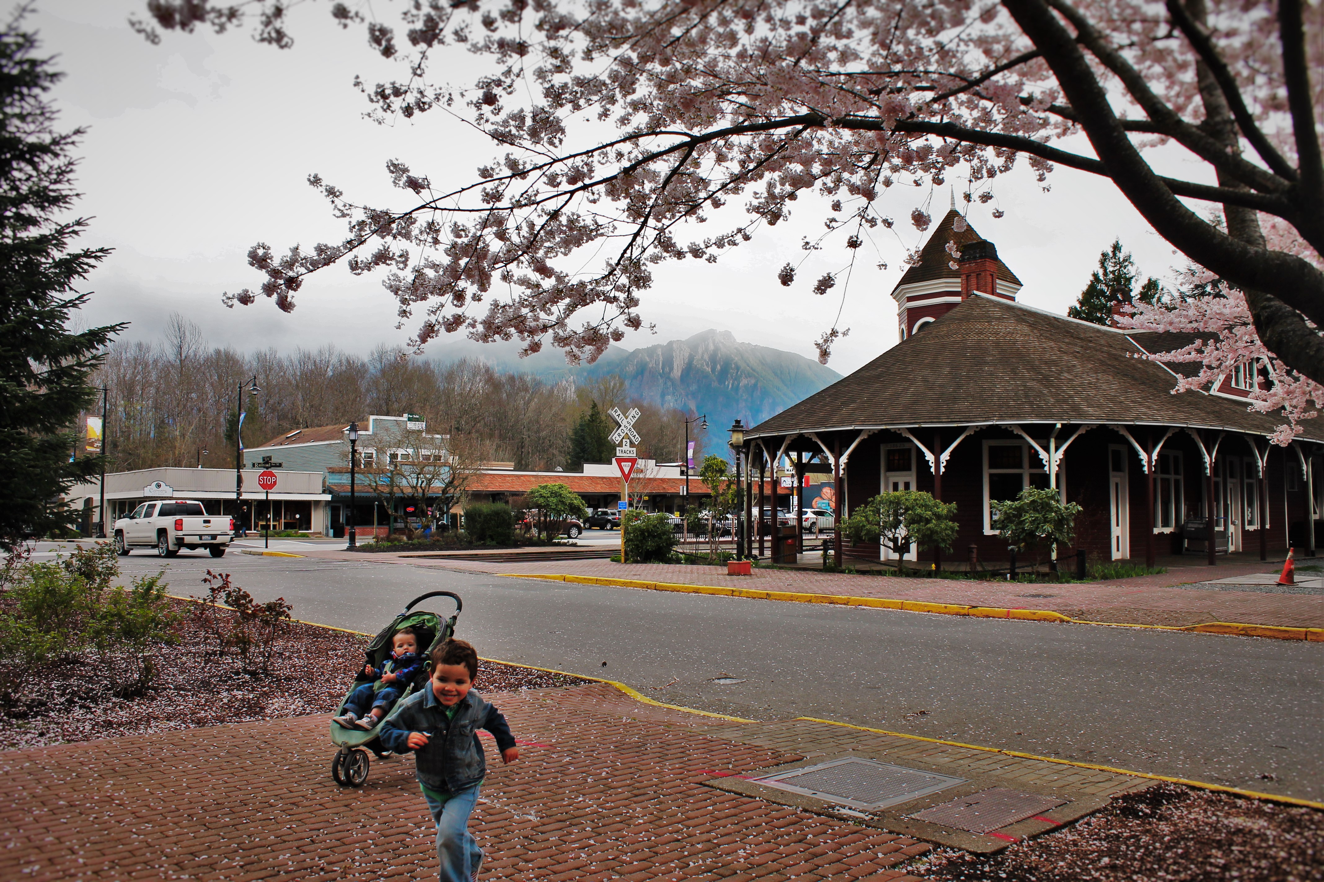 Taylor Kids with Old Snoqualmie Train Depot with Cherry Blossoms Washington 1