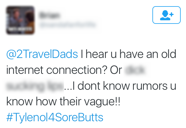 The initial public tweet stated that our oldest has the same mouth as me… which within seconds turned into an outpouring of horrible comments about the kids being raised by pedophiles, the kids being sexual assault victims, and also that the kids perform sexual acts. One person said that our oldest has “D.S.L.” which you can look up the definition here if you must. It’s awful.