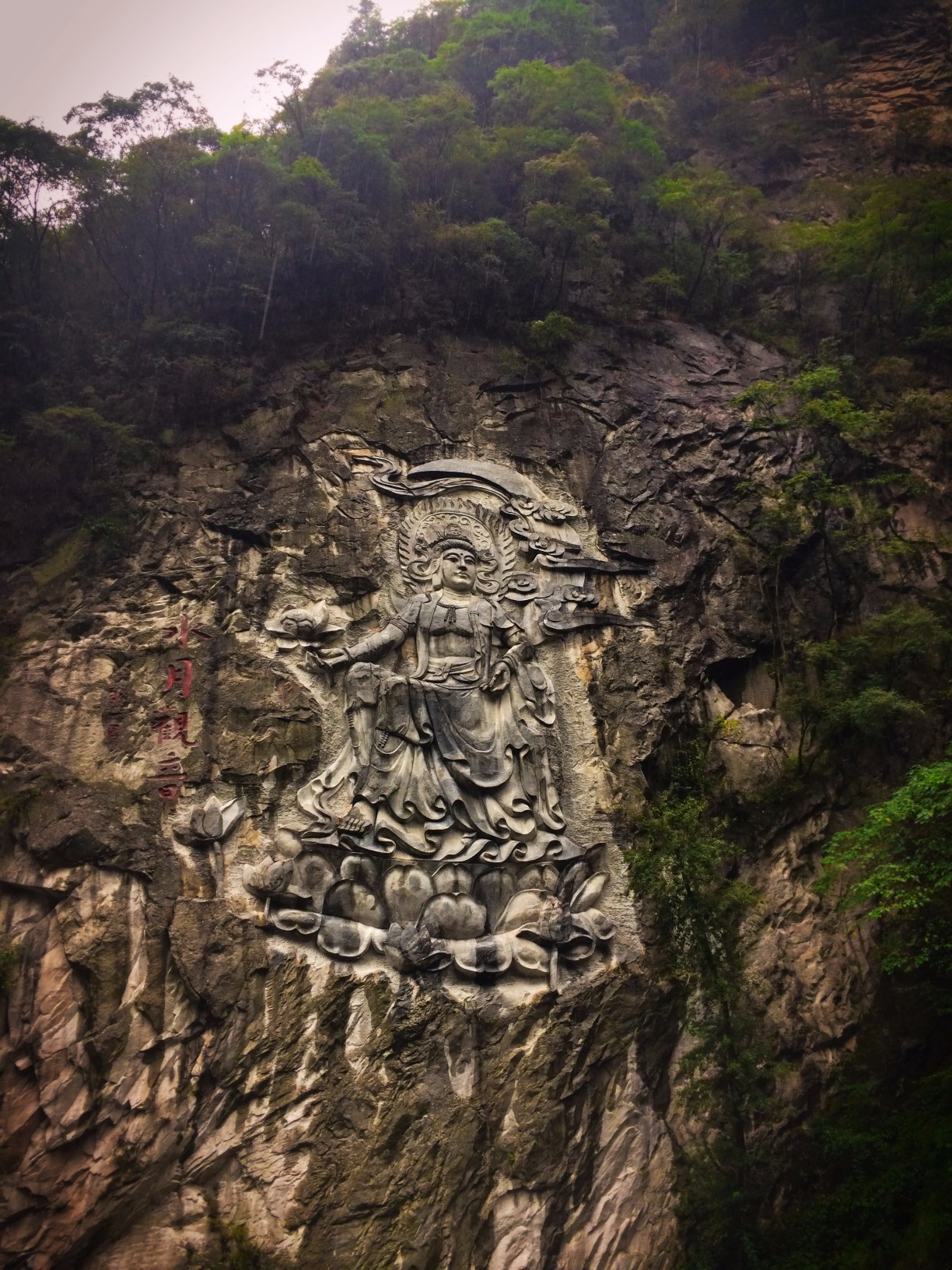 We saw enormous Buddhist carvings in cliffs, trees changing color in the middle of the river, Buddhist temples on the hillsides and more. The bridges and art were gorgeous and harkened back to the Imperial Gardens of the Tang Paradise in Xi’an. Really, with the weather we had in front of us, had we know what was in store we would’ve spent all day hiking the river trail and seeing what other beautiful sights lay before us.