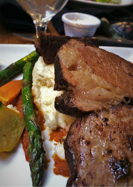 We found a new favorite appetizer:  tempura asparagus.  So good and egg free!  We also had some wonderful entrees that captured what you’d expect of a mountain lodge.  Chris ordered braised short ribs with polenta.  There was nothing left from his dinner, but I can attest the the short ribs were quite flavorful and tender.  I enjoyed the cedar planked salmon with wasabi mashed potatoes. I called out the obsession Pacific Northwest people have about salmon in our article about the Kingfisher Restaurant:
