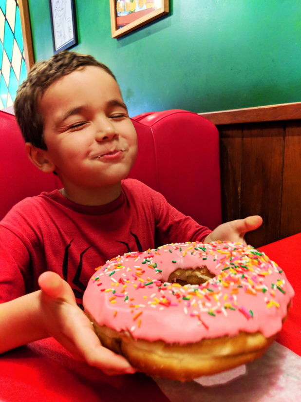 Other fun we had as we wandered, since the boys weren’t into riding attractions, was sharing the Big Pink Donut available in Springfield. This might not sound that great, but OMG, it’s the best doughnut ever and one is big enough for a family to share. Small kids see special treats with different eyes than parents sometimes, and if you’re going to choose one special sugary treat to share, go for the Big Pink Donut.