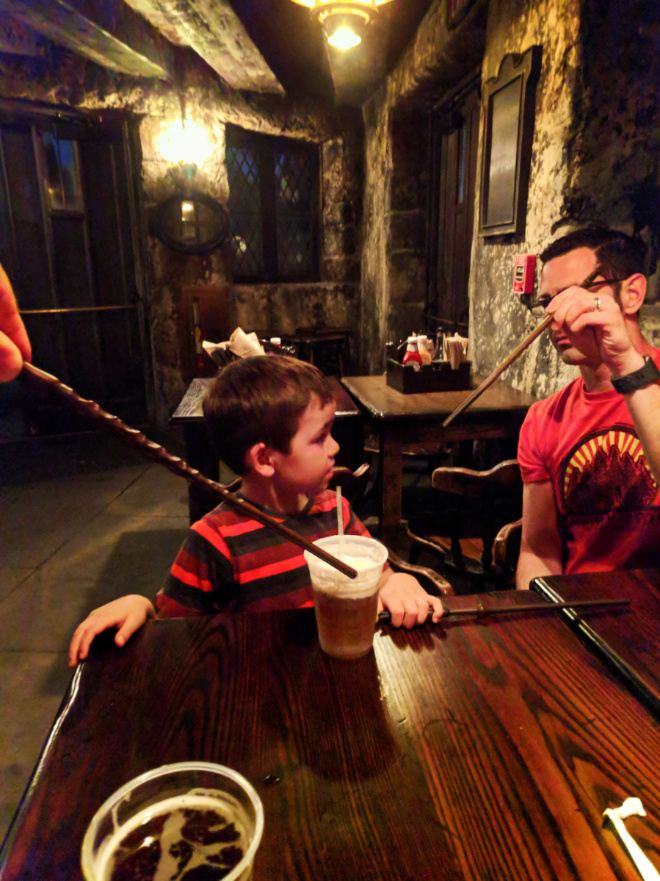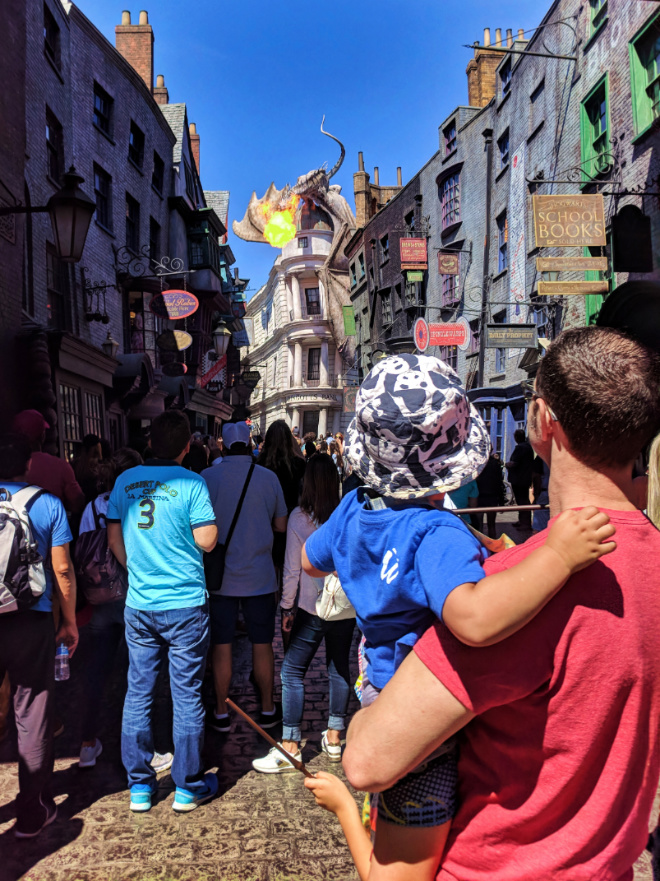 Our first experience: we entered Diagon Alley through the brick wall, wands at the ready, and immediately the fire breathing dragon came to life directly in front of us. Elliott (3 years old) freaked out and has never been more terrified in his life. We then left.