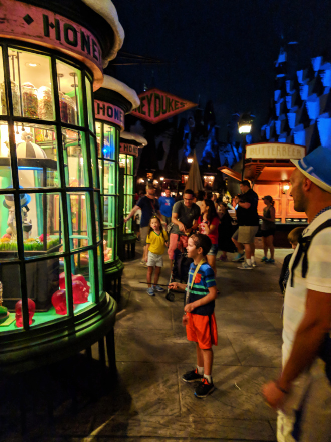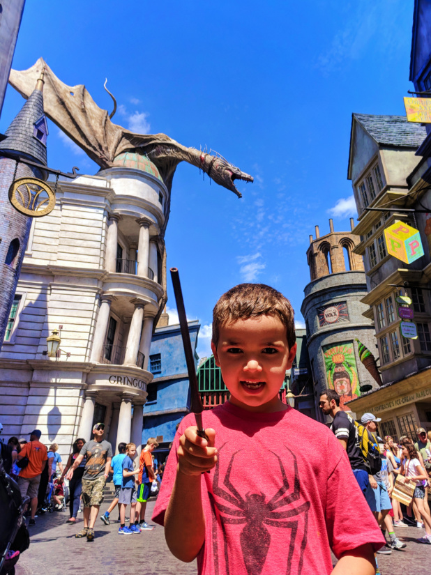 For our oldest son, Oliver (6 years old), he LOVED everything about Diagon Alley and was quite good at casting spells. At 6 years old he was still too scared to ride Escape from Gringotts (which is super cool!) but enjoyed the performances on the stage, the spell casting, and window shopping in Fred and George’s shop. Oh, and he was very proud to tell everyone that he’s a Hufflepuff.
