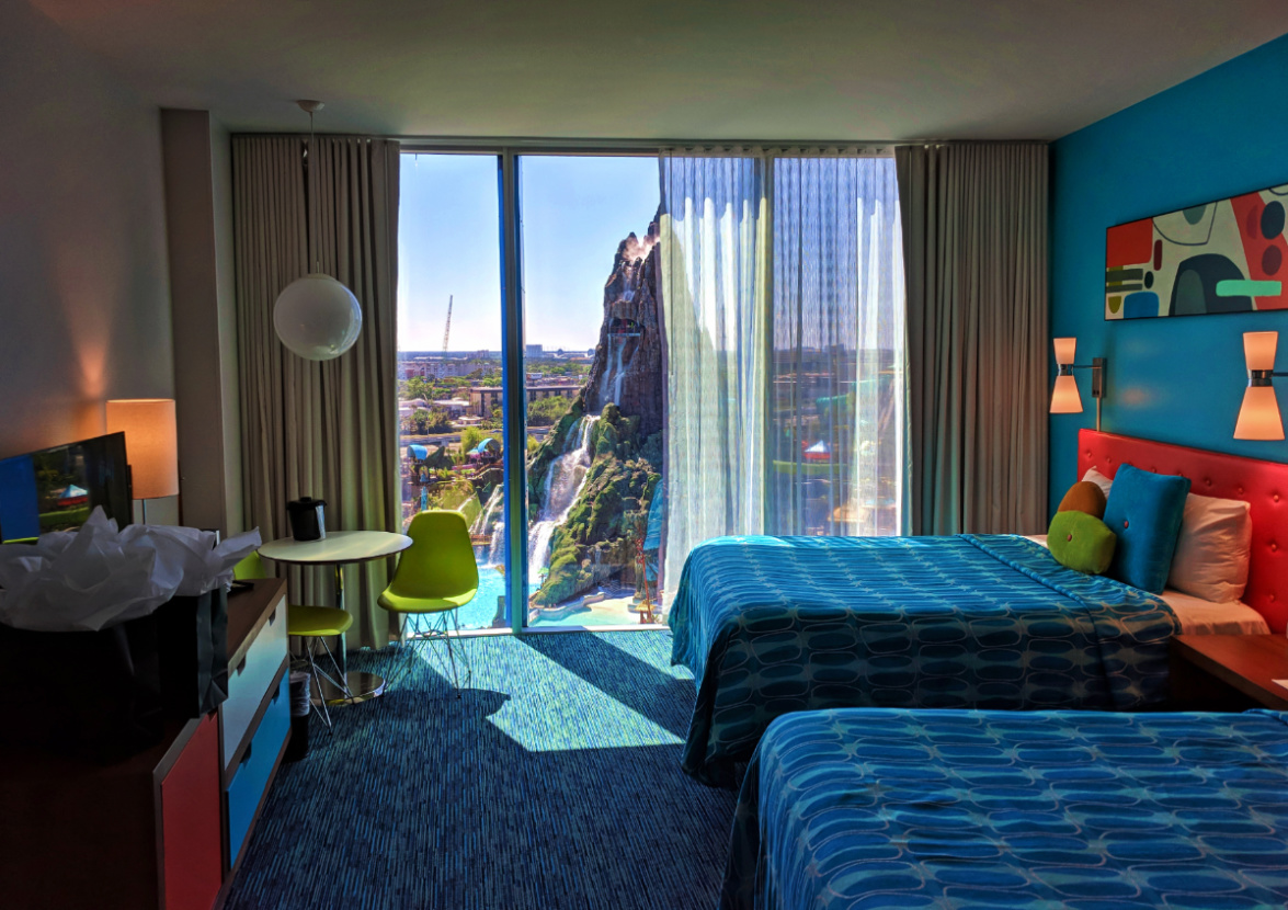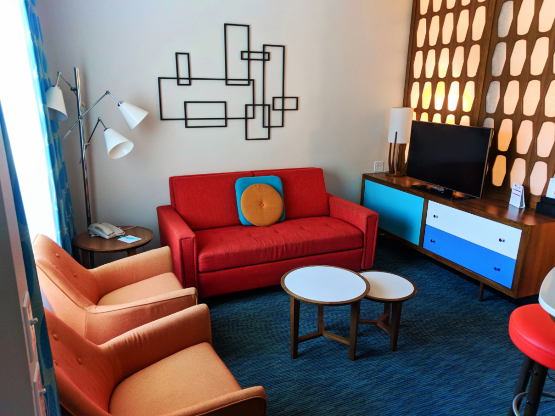 Book a family suite (pictured below w/ couch) here! Or book any other Cabana Bay room here.