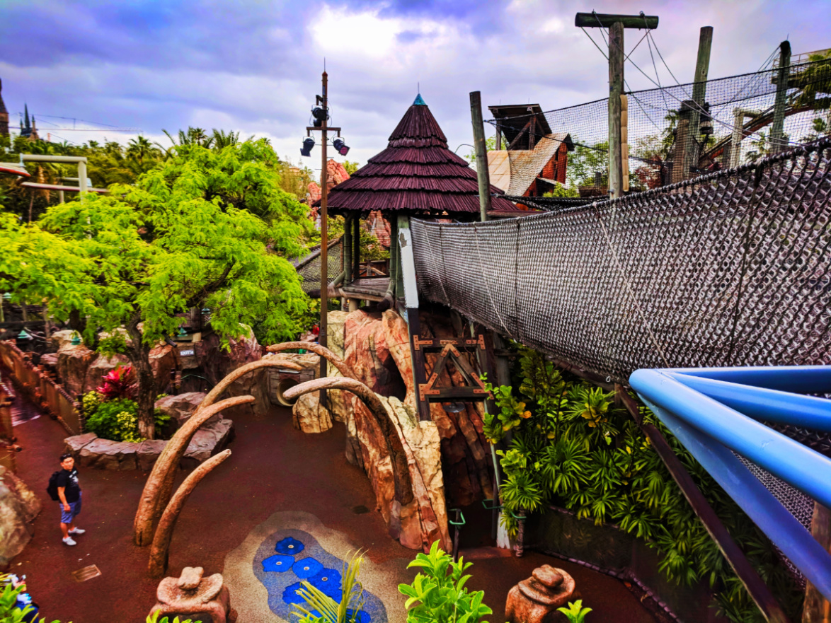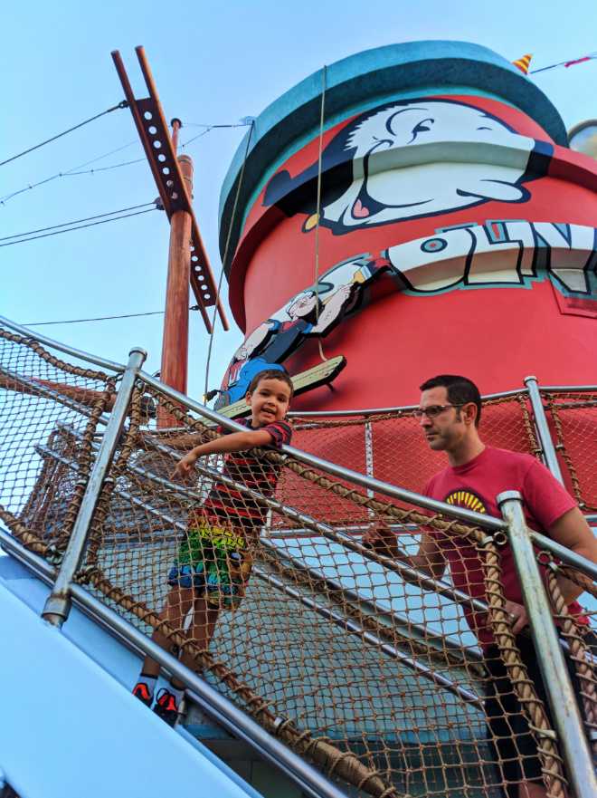 Universal Orlando is great about spots like Toon Lagoon mixing big thrills for big kids with play space for young ones. Popeye’s Boat – Me Ship, The Olive – was a great find here. Almost like a rubber bounce house, Popeye’s Boat is safe for running around and climbing and playing, equipped with slides, water cannons for shooting the river ride below, and great views. Us Dads always love when we find these quiet, nearly undiscovered areas. Our family takes full advantage of spaces like this to make our travels easier.