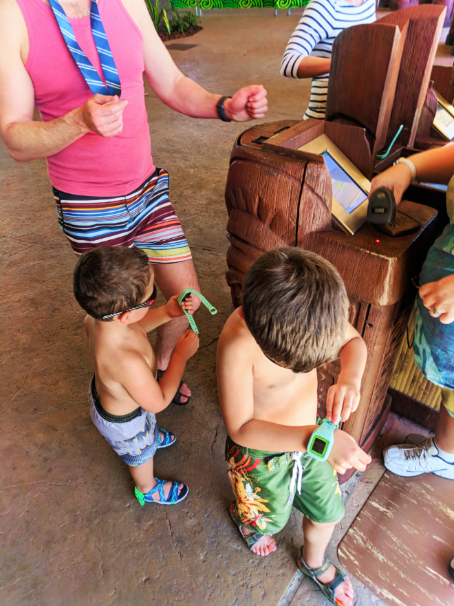 Our other favorite part of Volcano Bay that was perfect with small kids was the Kopiko Wai Winding River. A slow flowing river of fountains and waterfalls, it was great to do as a family over and over. Universal Orlando Resort is great about providing plenty of life jackets for small kids at all of the pools and Volcano Bay is no exception. We got the kids secured in life jackets before getting in the lazy river and it made it stress free. Our big guy (6 yo) loved having the freedom of floating the river separate of us (but always in view) and Elliott (3 yo) just loved holding hands and splashing as we went.