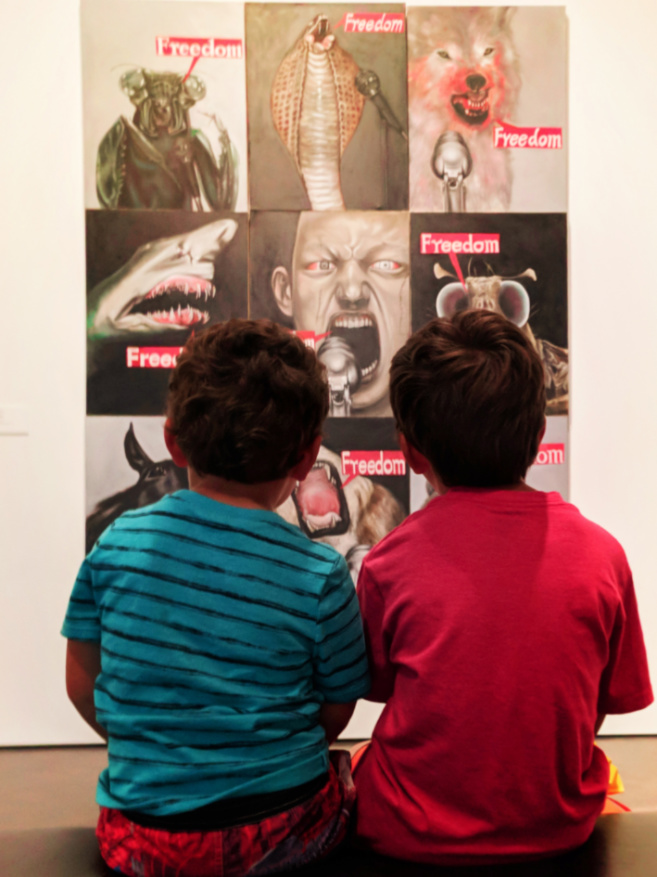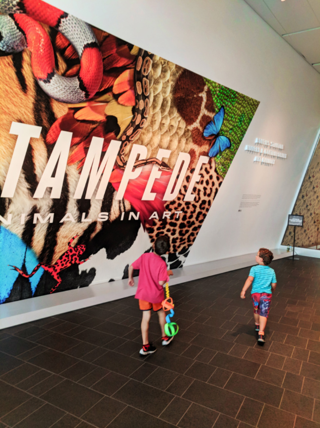 Often we head right for the children’s museum and outdoor spaces, but went right for the Art Museum this time. Immediately we had to go into the DIY art room so the kids could get some arts and crafts out of their system before checking out the exhibits. Upon heading up into one of the architecturally coolest buildings around we we immediately pulled into one of the many family spaces for interactive art. After some play time, we got into the brunt of the museum. Our favorite exhibit was Stampede, animals in art.