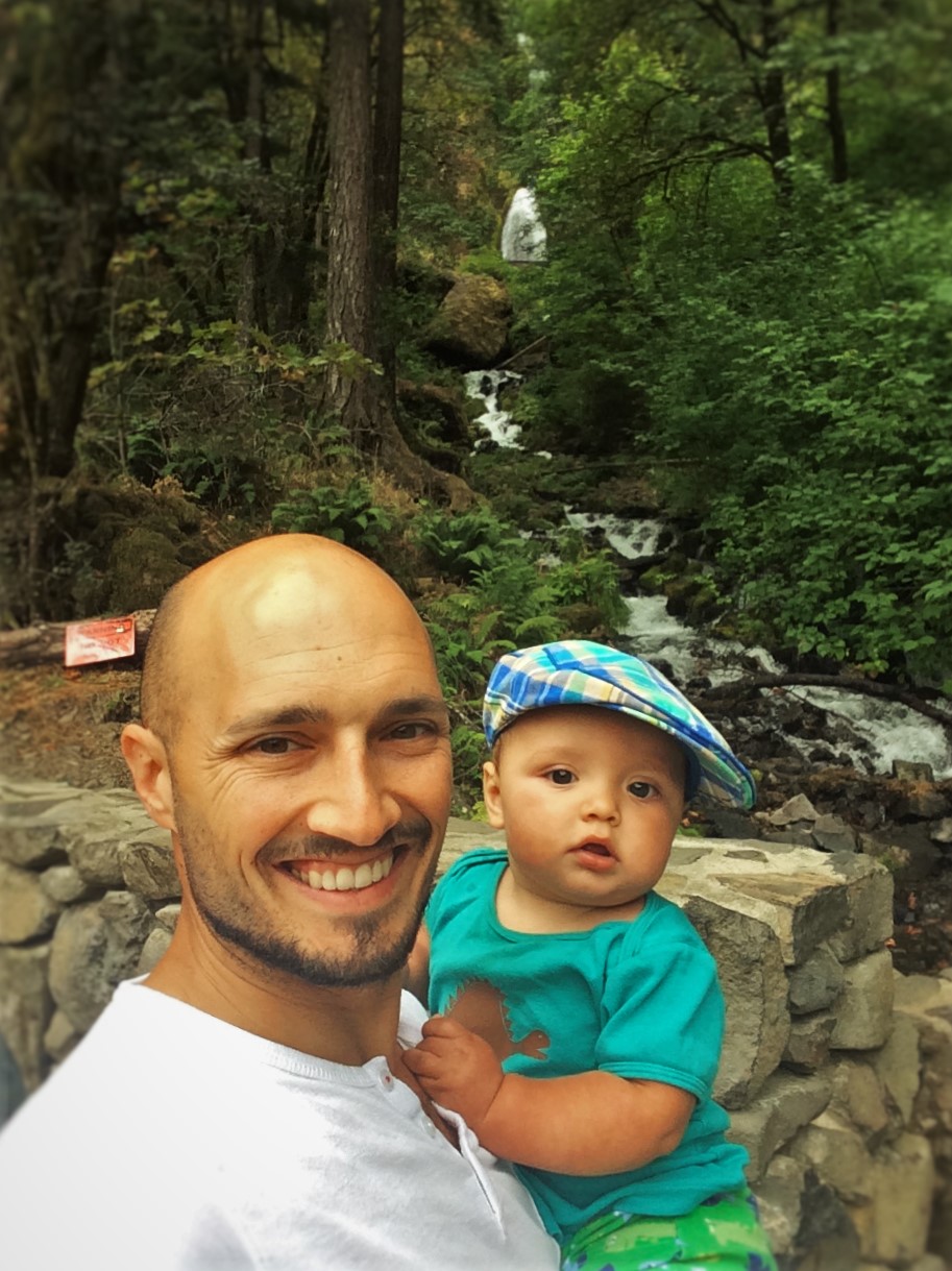 Rob Taylor and TinyMan at Wahkeena Falls Waterfall Area Columbia Gorge Oregon 2traveldads.co