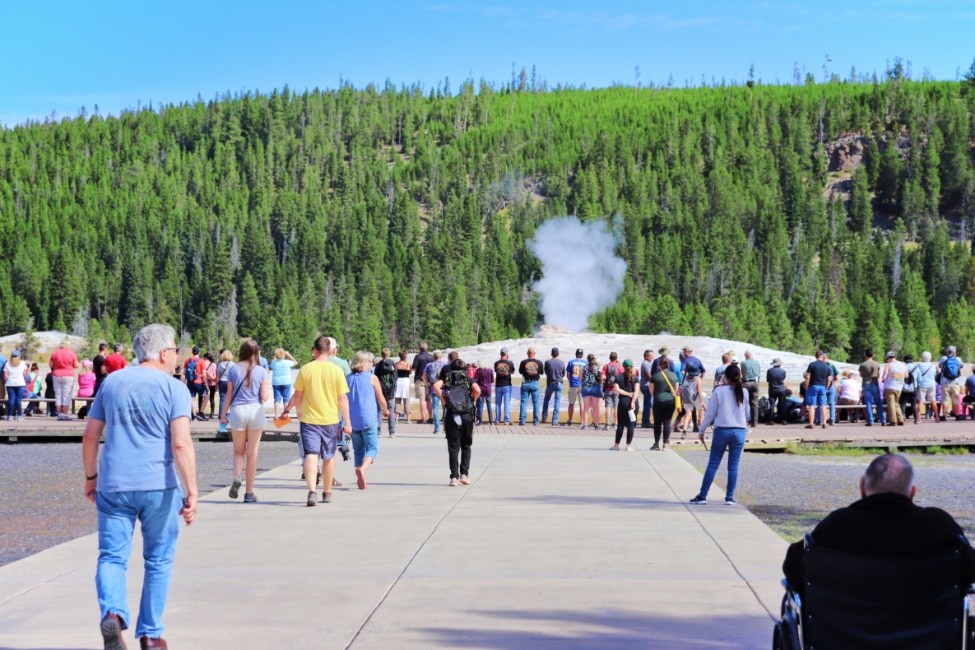 Crowds Gathering at Old Faithful Geyser Yellowstone National Park Wyoming 1