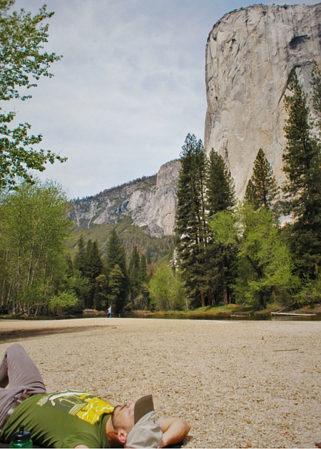 Rob Taylor relaxing at Cathedral Merced River Yosemite National Park 2traveldads.com